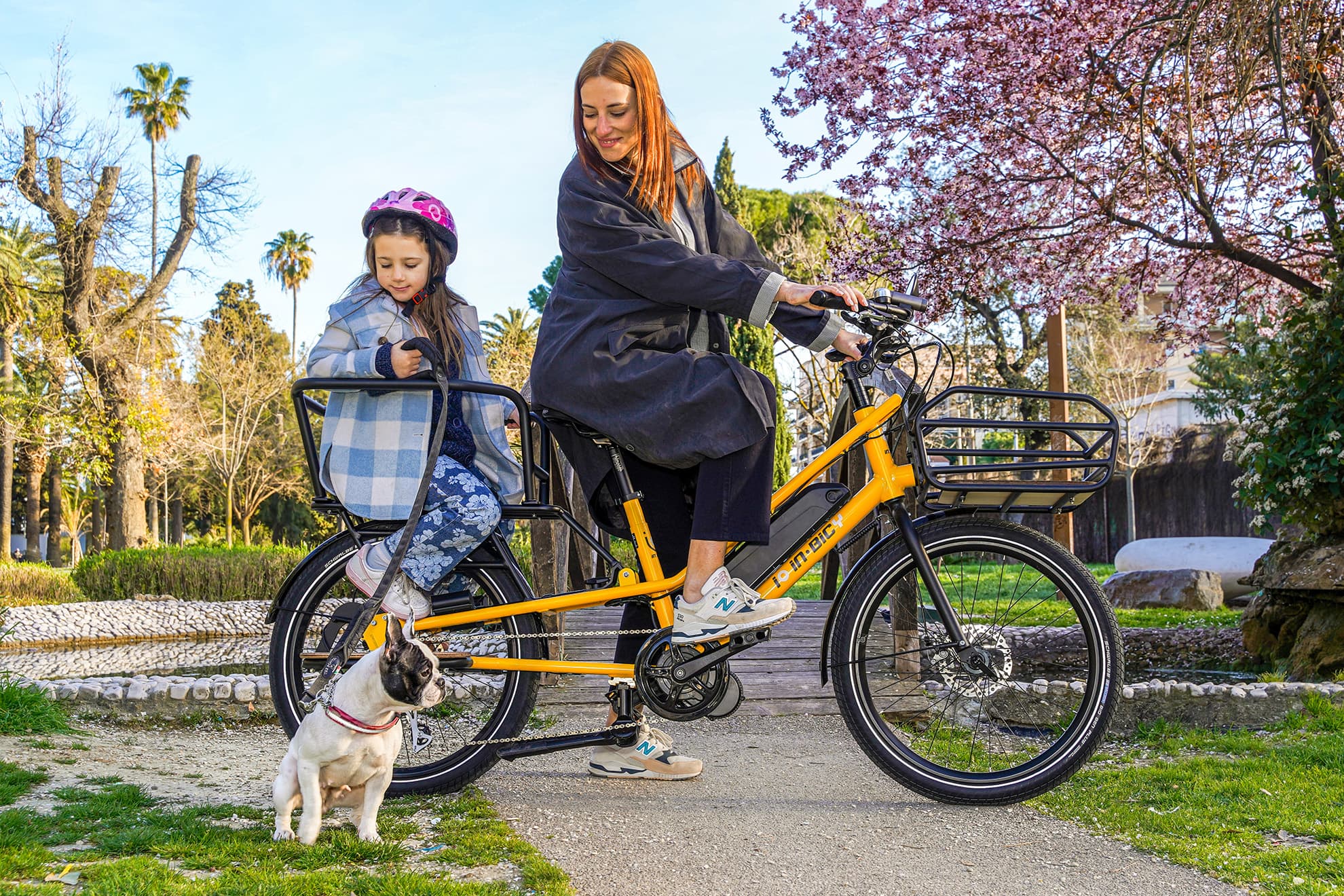 There is one particular category to which this bike is particularly suited, although as mentioned, it really is suitable for any use, and that is for those who, in addition to being a worker, an adventurer, a sports enthusiast, are also parent of one or more children of different ages. The patented flash switch system allows the iO to switch from one moment to the next in today's hectic daily life with us with the practical three-step hitching and unhitching system of the various carriers: the maxi-carry basket on the handlebar at the front (holds up to 25 kg and is also suitable for transporting small animals), the footrests and protective bars to keep the little ones safe, the seat cushions (for up to 3 passengers), the briefcase and the shopping basket. In no time at all, iO will go from being the means of transport you used to take the little ones to the park, to the elegant vehicle that takes you downtown to meet the client or to dinner with friends.