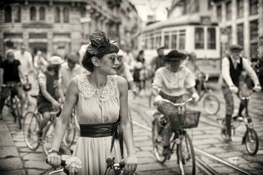 In barba ai moralismi e alle teorie, la donna continuò a salire in sella, nonostante la difficoltà di pedalare con abiti decisamente incompatibili con la pratica del ciclismo.