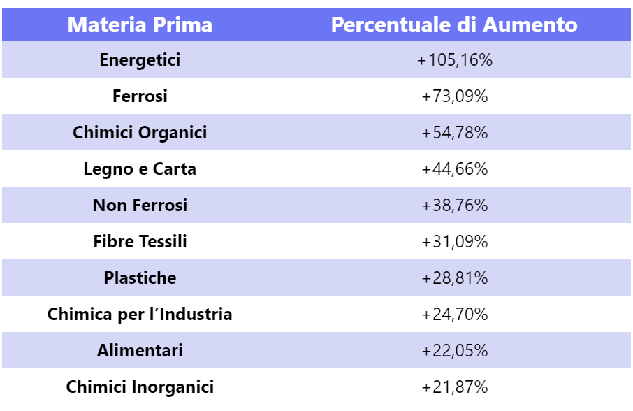 Nella tabella qui sotto è possibile vedere le materie prime che più sono aumentate tra 2020 e 2021.